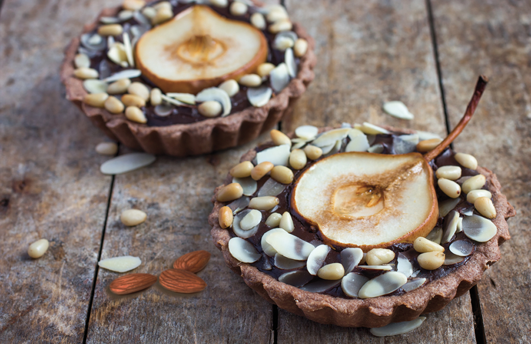 Sfilare i 2 gusci dagli stampi, aggiungere la ganache al cioccolato a cucchiaiate. Tagliare la pera e porne metà in ciascuna tortina. Decorare la superficie con scaglie di mandorle e pinoli.
