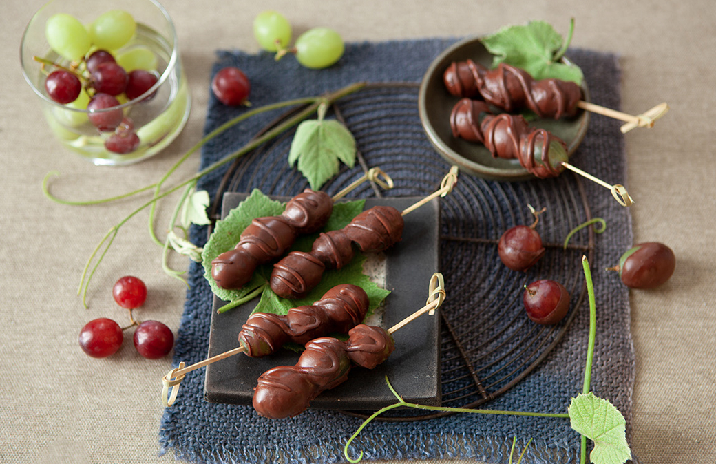 Lavare sotto l’acqua corrente il grappolo d’uva, asciugare bene, asportare gli acini. Infilarli negli spiedini, suddividendoli in modo uniforme. Sciogliere 100 g di cioccolato a bagnomaria e trasferirlo ancora caldo in una ciotolina. Immergere gli spiedini, facendo ruotare rapidamente gli acini nel cioccolato e cercando di ricoprirli interamente.2