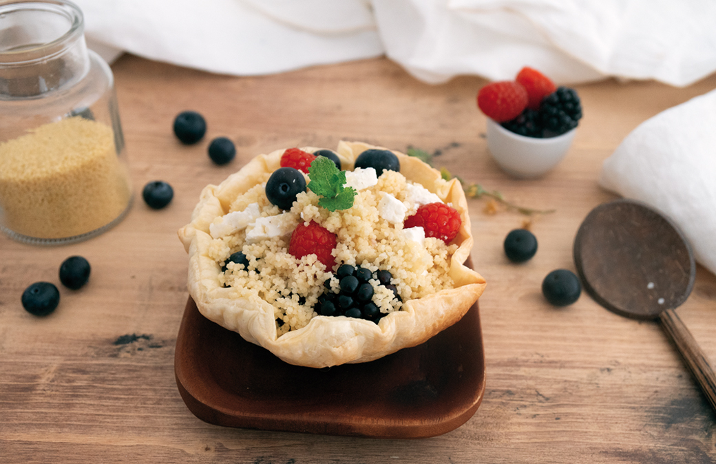Mentre cestino di pasta e cous cous si raffreddano, preparare un’emulsione di lime, olio, aceto, sale e pepe. Mescolare con delicatezza frutti di bosco, feta sbriciolata ed emulsione di lime, aggiungere il cous cous. Servirlo nel cestino di pasta sfoglia.