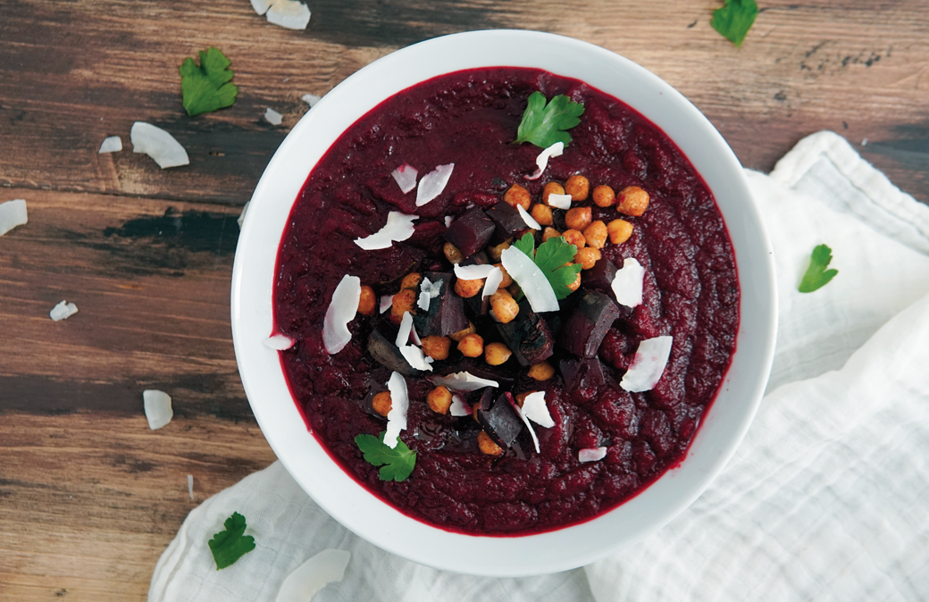 Togliere con una paletta forata metà delle barbabietole e frullare grossolanamente il resto, riducendo in crema. Cuocere il composto altri 5 minuti a fuoco vivo. Comporre il piatto mettendo la vellutata, i dadini di barbabietola, i ceci tostati, prezzemolo fresco, scaglie di cocco e olio d’oliva.