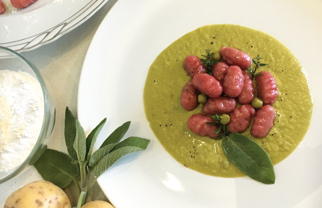Portare a bollore una pentola d’acqua. Aggiungere il sale e poi tuffare gli gnocchi. Quando affioreranno in superficie (2-4 minuti), saranno pronti. Scolarli man mano con una schiumarola e condire con il burro sciolto con qualche fogliolina di salvia. Versare un mestolino di vellutata di piselli in ogni piatto e adagiarvi gli gnocchi. Spolverare con pepe e grana e decorare con qualche foglia di timo e alcuni pisellini tenuti da parte.