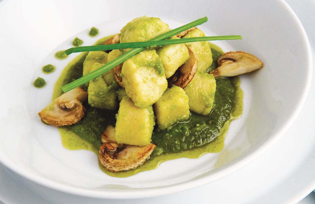 Mondare e bollire i friarielli. Soffriggere in un tegame uno spicchio d’aglio, olio, erba cipollina e peperoncino, aggiungere i friarielli e infine la provola. Quando il formaggio si scioglie, aggiustare di sale e frullare il tutto. Affettare i funghetti e saltarli in padella con un filo d’olio e uno spicchio di aglio.3