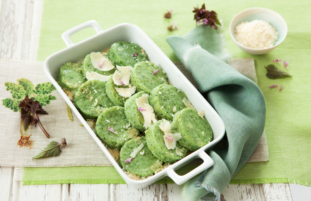 Preparare il semolino: portare a ebollizione il latte con il sale, versare a pioggia la semola e, sempre mescolando, continuare la cottura. Aggiungere gradualmente la purea di verdure, continuare a mescolare per incorporare bene il composto, cuocere per una decina di minuti. Lasciare intiepidire e aggiungere il burro, mescolando ancora. Versare il semolino verde in una teglia, spalmare il composto con una spatola per livellare e ottenere uno spessore di circa 1 cm. Lasciare raffreddare. Con uno stampino rotondo ricavare tanti dischetti.3