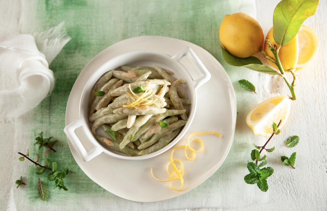 Preparare il condimento. Lavare il limone, ricavare delle striscioline dalla scorza con un pelapatate o un coltellino e tenerle da parte. Spremere e filtrare il succo, metterlo in un pentolino con il brandy e lo zucchero. Lasciare ridurre della metà il volume, aggiungere una spolverata di peperoncino, quindi incorporare la panna. Versare gli gnudi in abbondante acqua salata, scolarli appena salgono a galla. Condirli con la salsa al limone e profumare con le foglioline di menta fresca e le scorze di limone.