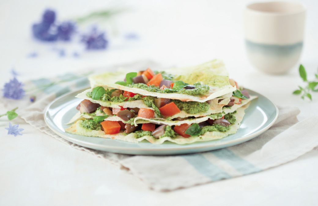 Predisporre quattro fogli di pane carasau per piatto, iniziare a comporre la lasagnetta. Formare gli strati, inumidendo i fogli di carasau con la crema di lattuga, spennellandoli leggermente. Mettere su ogni foglio un cucchiaio abbondante di crema di lattuga, le verdure saltate e qualche oliva taggiasca. Completare con erbe fresche, decorando a piacere l’ultimo strato. Servire a temperatura ambiente