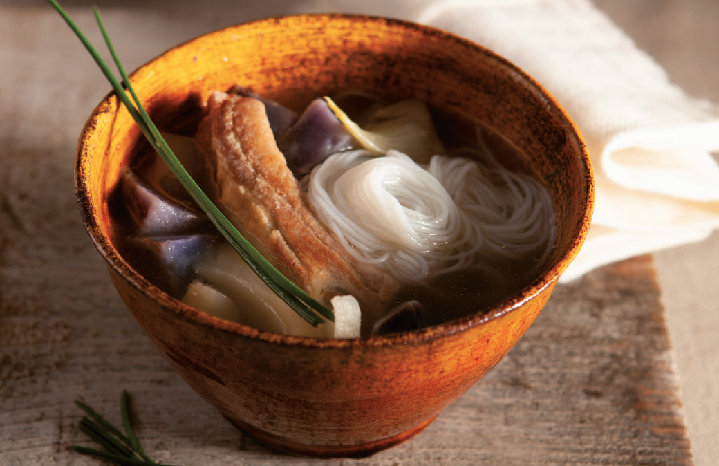 Portare a bollore in una casseruola dell’acqua leggermente salata, tuffare i noodles, lasciare cuocere per due minuti o per il tempo riportato sulla confezione. Comporre nelle fondine prima i noodles, poi le costine con le verdure e infine ricoprire con il brodo. Completare con erbe a piacere.