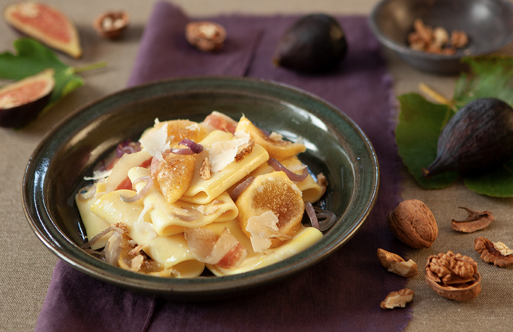 Pulire i fichi e tagliarli a fette spesse. Unirli al guanciale insieme alle noci, lasciare insaporire qualche istante. Scolare la pasta, tenendo da parte un po' dell’acqua di cottura. Mettere i paccheri nella padella con il sugo precedentemente preparato, unire poca acqua di cottura se necessario, insaporire per pochi istanti.3