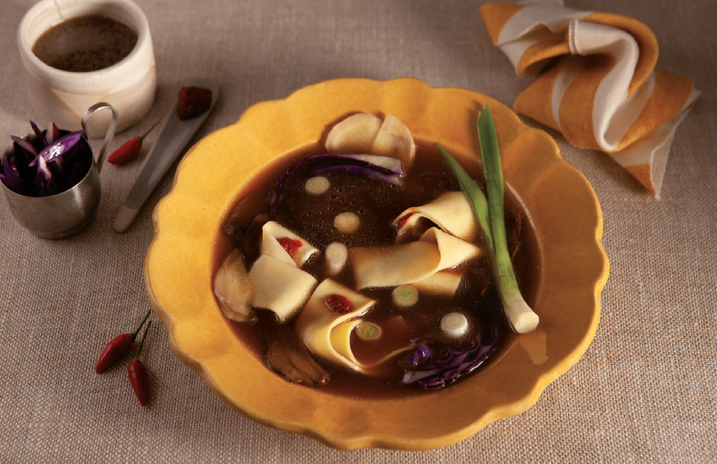 Scaldare l’olio in una padella ampia. Aggiungere lo zenzero e l’aglio, cuocere per 5 minuti, mescolare spesso, fino a quando saranno dorati. Aggiungere i peperoncini solo dopo avere inciso le punte, unire il brodo e i funghi secchi, portare a bollore. Coprire la pentola, cuocere a fuoco lento per 30/40 minuti. A fine cottura eliminare i peperoncini, tenere da parte.2
