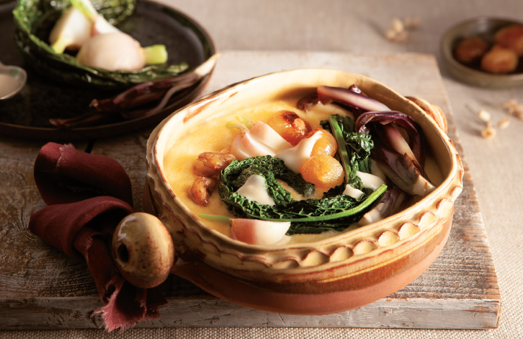Mondare il resto delle verdure, lessare la rapa, tagliarla a pezzi, tenere da parte. Scaldare in una padella poco olio, aggiungere il radicchio tagliato nel senso della lunghezza, il cavolo nero e infine la rapa a pezzetti; fare insaporire per qualche istante a fiamma vivace, aggiungere le castagne, lasciare insaporire. Distribuire la polenta nelle ciotole, completare con la crema di formaggio, le cipolline caramellate e le verdure stufate.