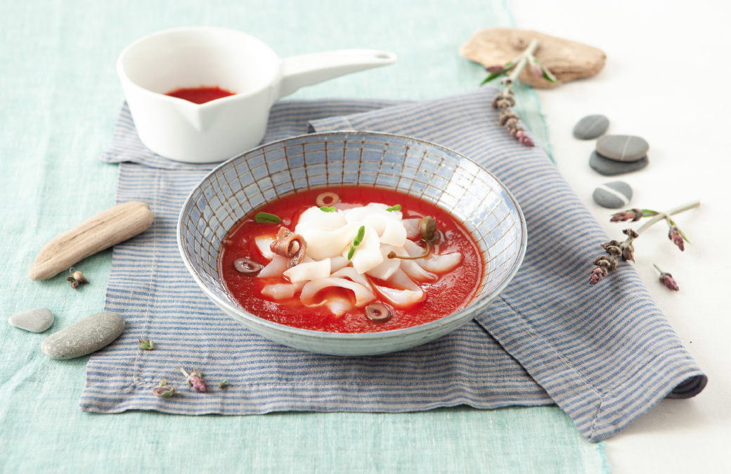 Setacciare il sugo, suddividerlo caldo in quattro fondine, posizionare un nido di tagliatelle di seppia al centro, completare con le olive taggiasche e un filetto di acciuga. Decorare con maggiorana fresca.