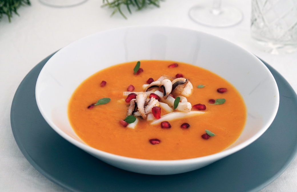 Pulire i calamari, tagliarli a striscioline, scottarli in un tegame con un filo di olio e un pizzico di sale. Distribuire nei piatti la crema e le striscioline di calamari e decorare a piacere con chicchi di melagrana.