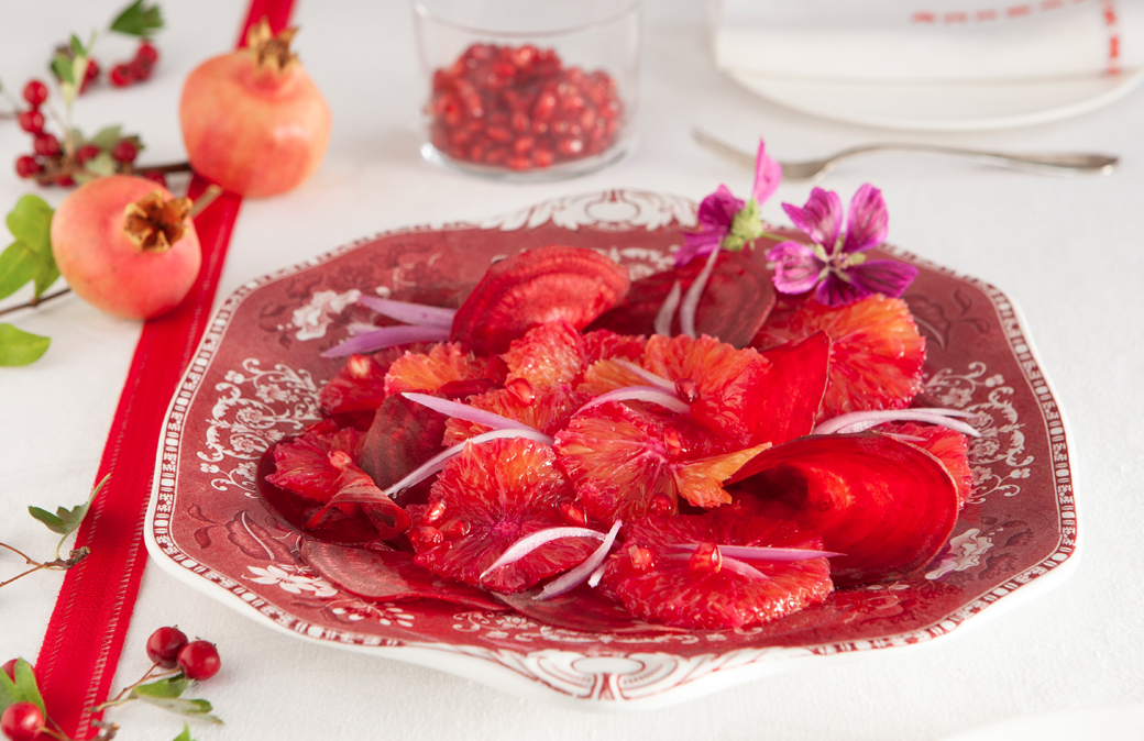 Versare il condimento sulle arance e sulle barbabietole, completare con i semi di melagrana.