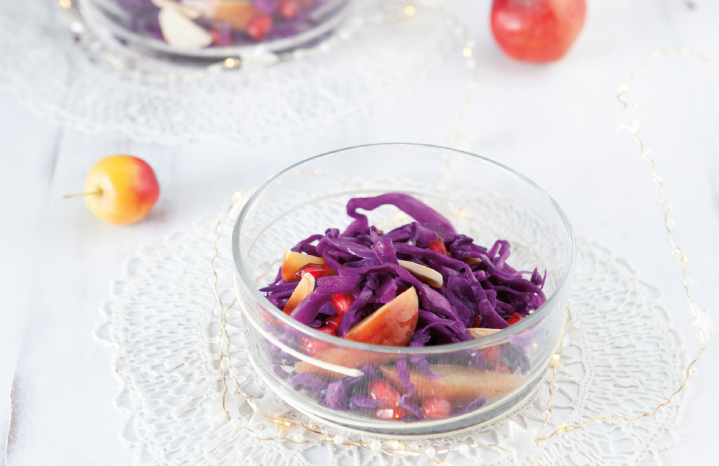 Scaldare una padella antiaderente con un filo d’olio, fare saltare velocemente il cavolo: dovrà ammorbidirsi e rimanere croccante. Unire le mele per pochi istanti, spegnere il fuoco.3