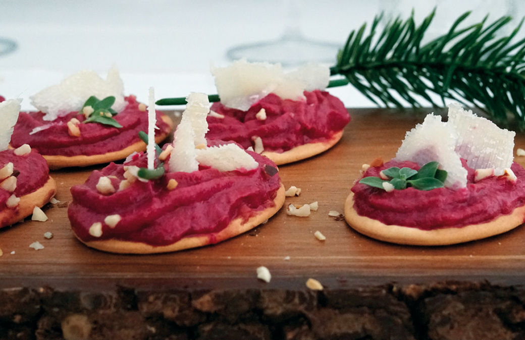 Una volta raggiunta la consistenza di una crema, spalmare sui cracker e aggiungere scaglie di grana, foglie di maggiorana e granella di noci.