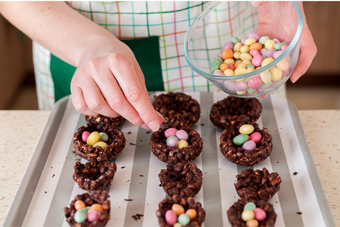 Prendere uno stampo in silicome per ovetti. Foderarne ciascun incavo con il composto di riso, cioccolato e cocco. Dovrebbero venire 20 mezzi ovetti. Lasciare solidificare in frigo. Rimuovere i mezzi ovetti solidificati dagli stampi. Riempirne la metà con ovetti di zucchero o cioccolato, oppure con confetti colorati, oppure ancora con praline o codette di cioccolato.3