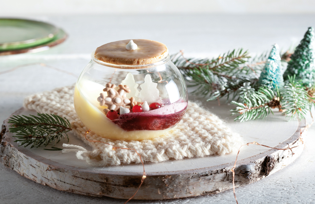 Preparare la glassa per decorare: mescolare lo zucchero a velo con l’acqua tiepida, fino a fare sciogliere lo zucchero, creando così una glassa liscia. Usare una siringa oppure una sac à poche per decorare le sagome dei fiocchi di neve. Lasciare asciugare qualche istante. Inserire nel bicchiere e completare la palla di Natale con i frutti rossi e qualche meringhetta. Ripetere la preparazione in tutti i bicchieri. Le palle si possono servire così, oppure chiuse da un biscotto decorato con una meringhetta.