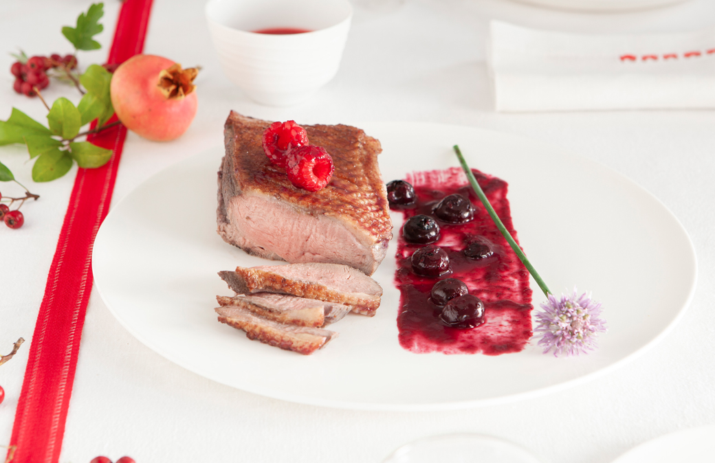 Incidere i petti d’anatra sul lato della pelle, salare e pepare. Cuocere in una padella con un filo di olio dalla parte della pelle per 5 minuti, sfumare con il vino bianco, lasciare evaporare per un paio di minuti, girarli e continuare la cottura per altri dieci minuti circa. Unire la salsa di lamponi, cuocere per altri 2-3 minuti. Lasciare insaporire la carne nell’intingolo, avvolgerla in un foglio di alluminio per mantenere morbida la consistenza.3