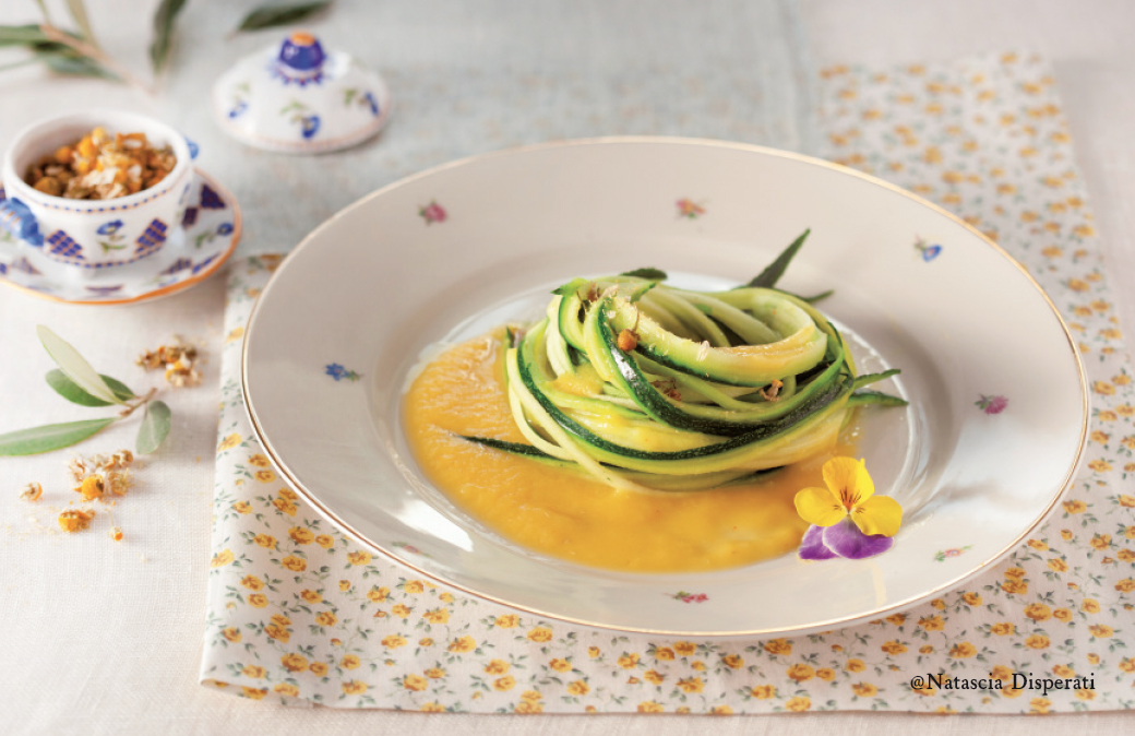 Scaldare l’acqua in una casseruola, salare e cuocere le porzioni di spaghetti di zucchine una alla volta (per evitare che si attacchino o rovinino, in quanto sono delicati), scolarli con un mestolo per spaghetti. Suddividere nei piatti il sugo di datterini e posizionare al centro gli spaghetti di zucchina, condendo con un filo d’olio. Profumare con fiori edibili e camomilla, a piacere.
