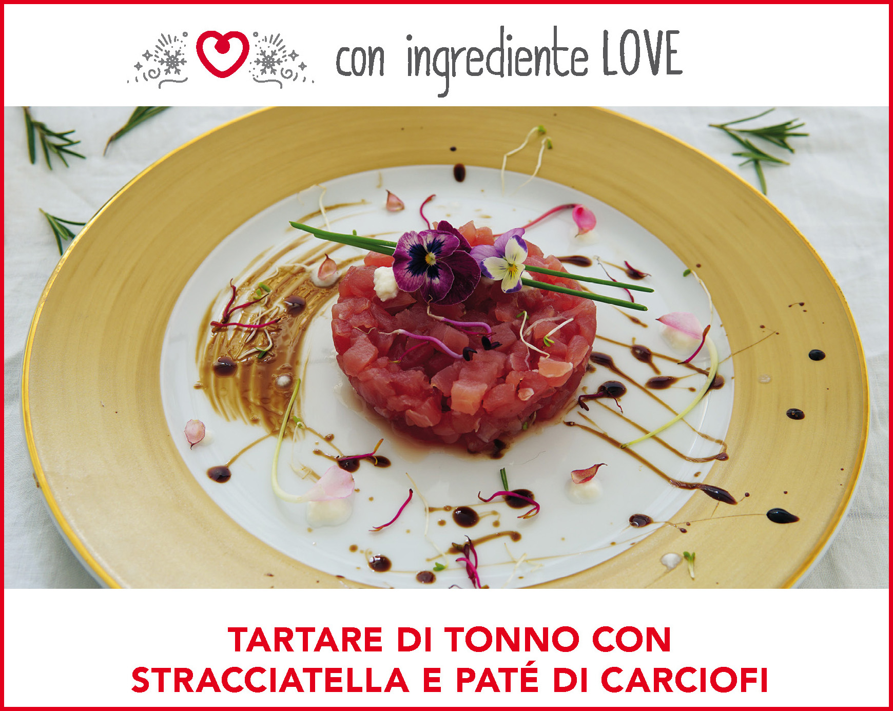 Versare in un piatto un paio di cucchiai di crema di stracciatella e, con un coppapasta, formare il primo strato di tartare di tonno. Aggiungere un cucchiaio di paté di carciofi e un ultimo strato di tonno, in modo che il paté rimanga nascosto dalla tartare.3