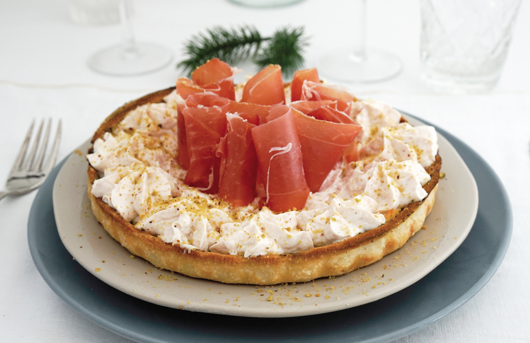 In un frullatore unire tutti gli ingredienti della mousse e frullare fino a ottenere un composto omogeneo; inserirlo in una sac à poche con la bocchetta a stella. Decorare la torta con la mousse e aggiungere le fette di prosciutto arrotolate e la granella di pistacchi.