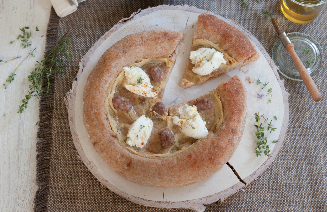 Con il dorso di un cucchiaio, stendere la purea di ricotta e mostarda al centro, completare con quenelle di ricotta e con rondelle di salsiccia. Infornare in forno preriscaldato a 250° per 8 minuti, controllare a vista. Irrorare con un filo d’olio crudo e profumare con erbe fresche.