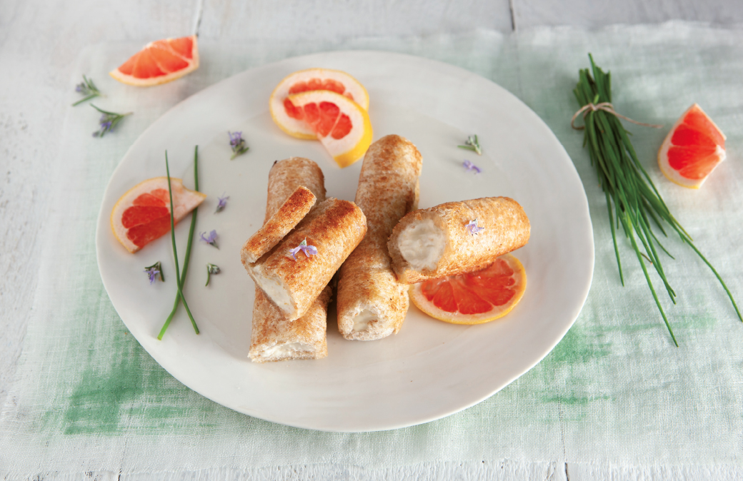 Spennellare gli involtini con l’olio e farli rosolare da tutte le parti per 2 o 3 minuti in una padella antiaderente. Servire i rotoli caldi, decorando con erbe fresche e con qualche fetta di pompelmo.