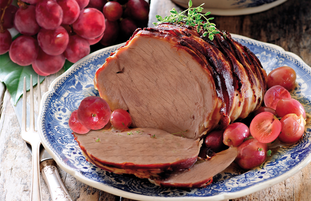 Lavare gli acini di uva e unirli all’arrosto insieme a due rametti di rosmarino. Cuocere in forno per altri 20 minuti. Avvolgere l’arrosto in un foglio di alluminio e lasciarlo riposare per 10 minuti. Tagliarlo a fette e servire con l’uva rosata tagliata a metà e foglioline di timo.