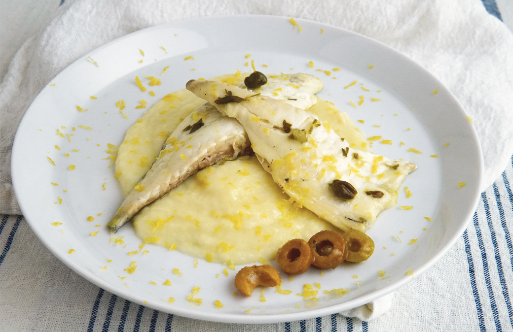 Lavare e sbucciare le patate e metterle in acqua fredda salata. Quando l’acqua inizierà a bollire, far cuocere le patate per 20 minuti, scolarle e ridurle in crema con un minipimer o un robot da cucina, aggiungendo al composto un po’ di acqua di cottura per renderlo più morbida. Mescolare le patate con il burro e la noce moscata, aggiustare di sale e pepe. Fare cuocere altri cinque minuti o fino alla densità desiderata. Aggiungere alla purea il succo di mezzo limone con la sua scorza grattugiata. Servire la purea insieme al pesce.