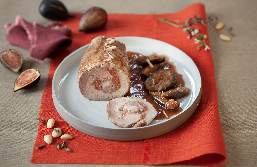 Preriscaldare il forno a 180°. Lavare i fichi, privarli della buccia, asciugarli delicatamente con della carta assorbente. Disporre la lonza aperta a libro tra due fogli di carta da forno, batterla per renderla più sottile. Eliminare la carta sulla superficie della carne, insaporire con una presa di sale, aggiungere le mandorle tagliate grossolanamente a scaglie, rivestire con le fette di prosciutto e la metà dei fichi tagliati e affettati spessi. Arrotolare la carne aiutandosi con la carta da forno, legare con lo spago da cucina.2