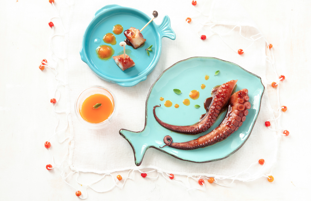 Realizzare la glassa per caramellare il polpo. Versare il miele, il burro e il vino cotto (o lo sciroppo) in un pentolino, cuocere a fiamma moderata, unire infine il brodo di pesce e proseguire per circa 20 minuti per ottenere una consistenza sciropposa. Spennellare ripetutamente la superficie dei tentacoli del pollo con la glassa, quindi infornare per 5 minuti a 180°. A cottura ultimata, spennellarli nuovamente con la glassa, disporre le porzioni nei piatti, decorare con la salsa al ketchup di carote e completare con erbe fresche.