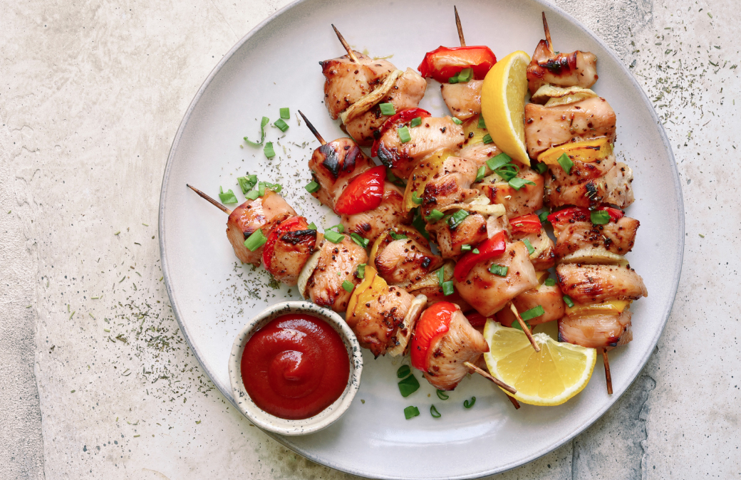 Trascorso il tempo di riposo, assemblare gli spiedini alternando i peperoni al pollo. Fare cuocere sulla griglia ben calda fino quando gli spiedini non risulteranno dorati. Servire con spicchi di limone.